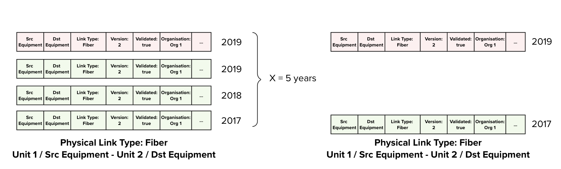 This will result in scenarios where the same data is populated multiple times over the course of multiple years. The reason to keep these multiple entries for the same physical links are: