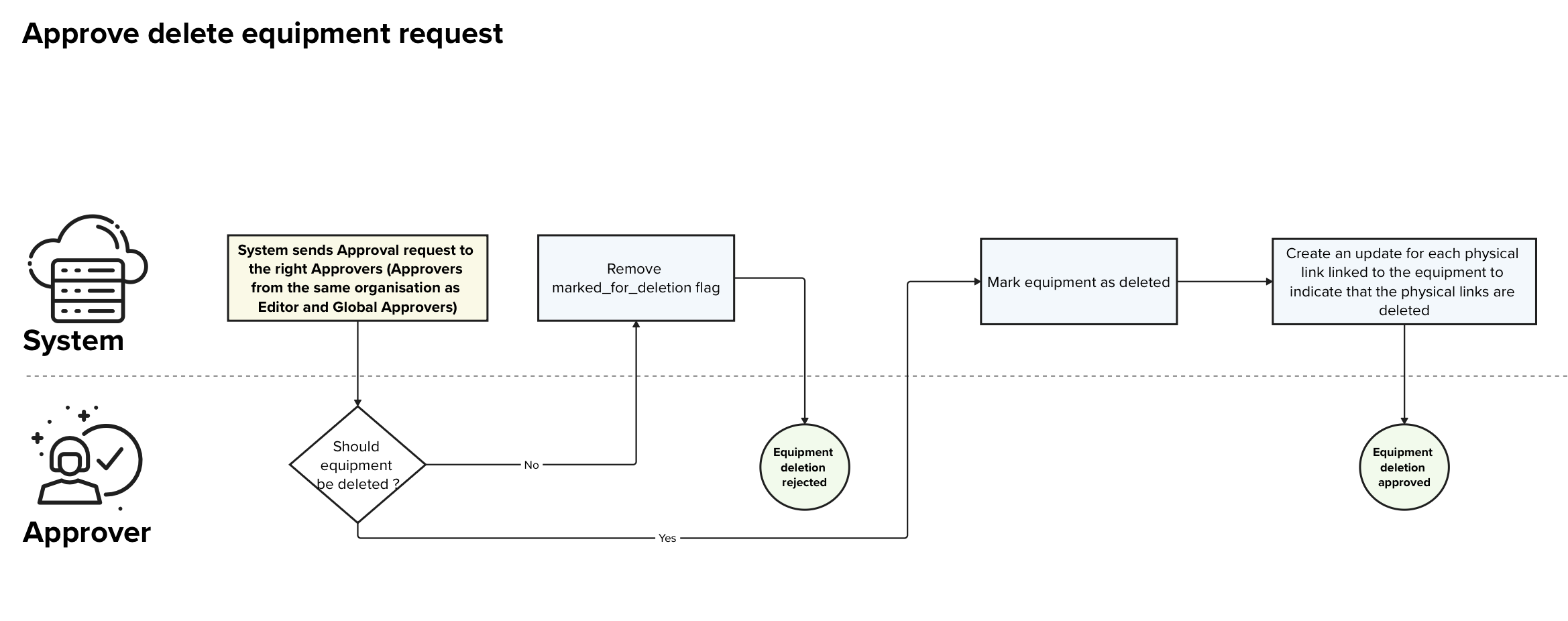 | 3 | The System marks the equipment with the flag “is_deleted = true” and adds the information on the date of validation and the user that validated the request | System | - equipment with flag “marked_for_deletion = true” | - equipment with flag “is_deleted = true” - approver set to the user that triggered the approval - approval date set to the current date |