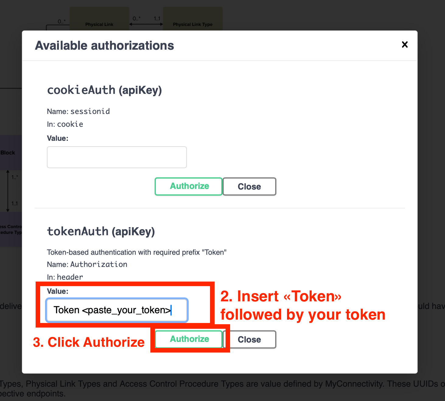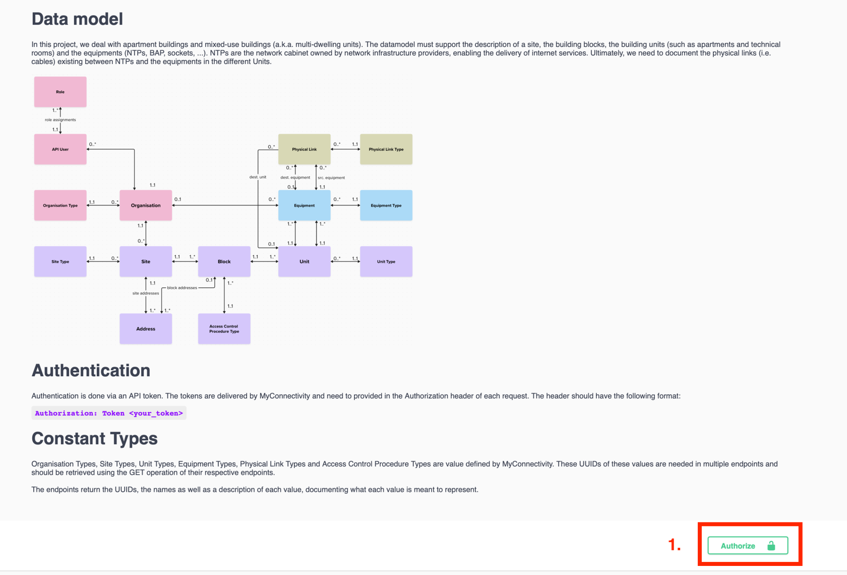 To use the API interactively in Swagger, you need an authentication token provided by MyConnectivity. You will find below the steps needed to configure the authentication on Swagger-UI.